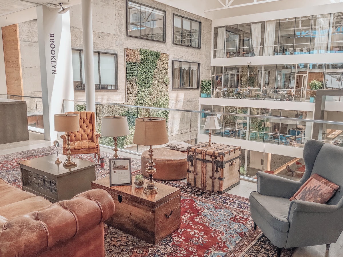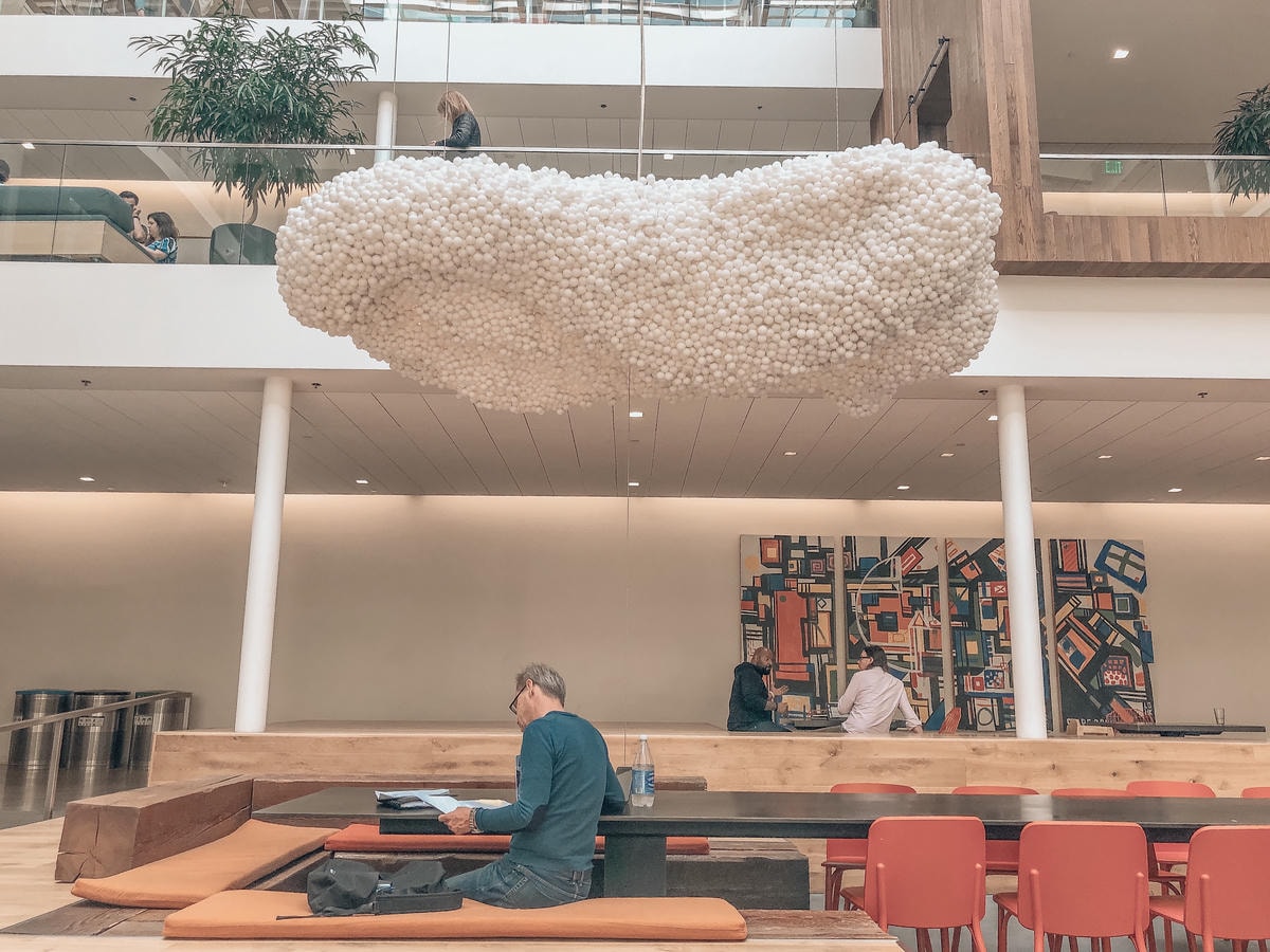 進到大廳後,四層樓的大片玻璃採光,配上其中一面的綠色牆面,在這陽光燦爛的建築裡工作心情都好起來,而且Airbnb 是可以帶狗狗來上班的! 大廳也會看到很多狗狗們趴在主人的腳邊,靜靜的陪著主人工作,真的太療癒太可愛。其他最吸睛的裝飾就是這大片雲朵是由30,000顆兵乓球組成,很能代表品牌中Air的意象。