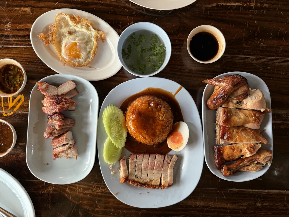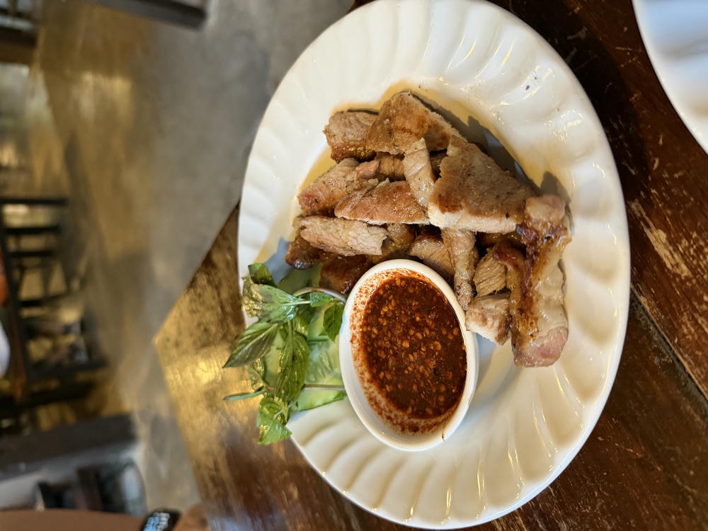 人生至今吃過最好吃的脆皮豬五花,因為我其實是不太敢吃肥肉,但這間的皮超脆跟有些炭香,肉的部分也不會有肥肉的油膩感,我完全可以自己吃完一份!烤雞雞腿的部分也蠻推的,雞肉頗嫩,重點是超便宜,三份肉+菜這樣點下來才 $200 多泰銖,絕對是清邁必吃!