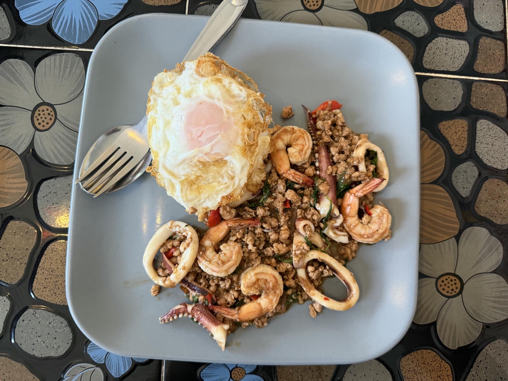 Aoyjai Kitchen 是一間在地的泰式家庭料理,菜色沒有太花俏,就是打拋系列料理為主。推薦點綜合的打拋飯(有豬肉+魷魚+蝦子),鍋氣很香、蛋白質充足,很像是你阿罵會在家裡炒出來的味道!店內小小的只有四桌,所以用餐時段通常需要等一下。