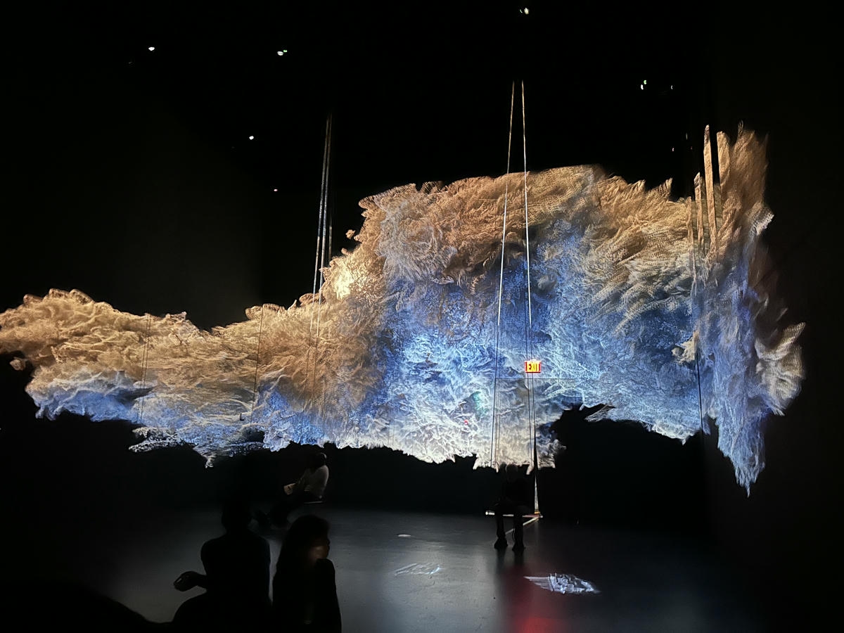 - 懸浮織物裝置:一大片類似紙張或織物的裝置懸浮在空中,透過燈光照射呈現藍色和金色漸層,看起來像是雲朵或地圖