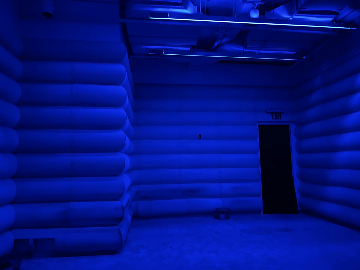 這個展間主打全向音效,聲音可以從任何方向傳來,甚至能感受到聲音在空間中移動。地板下有 36 個喇叭,站在裡面閉上眼睛,會有種被音樂包圍、甚至穿透身體的感覺。